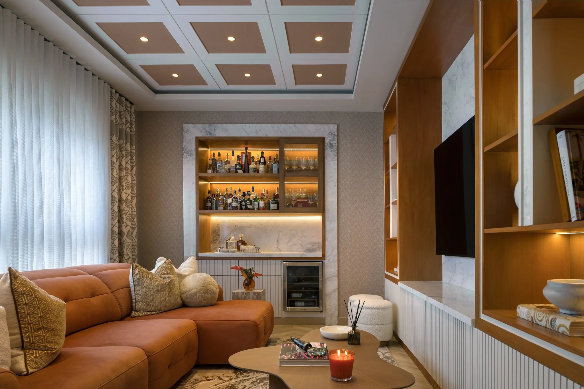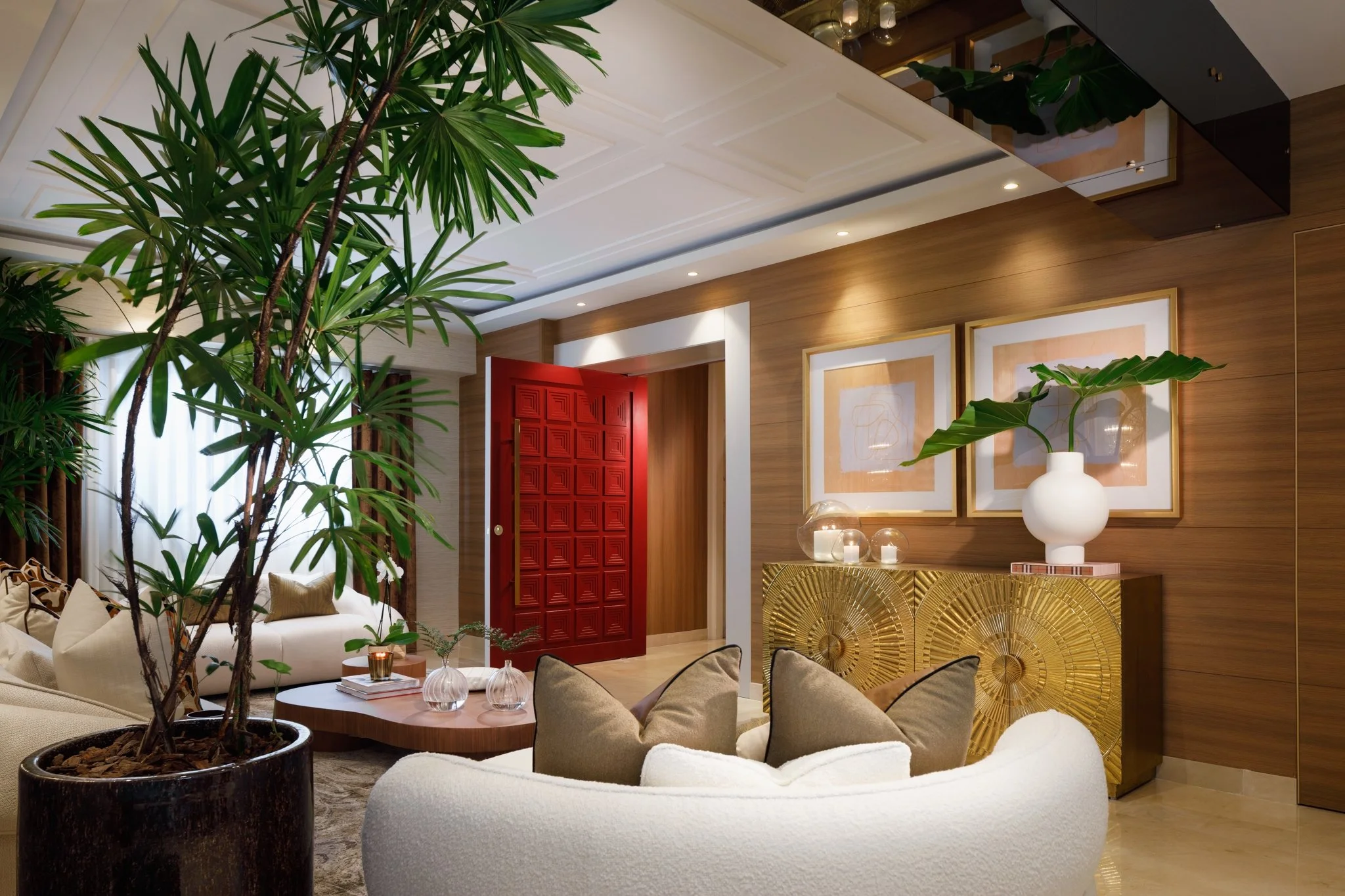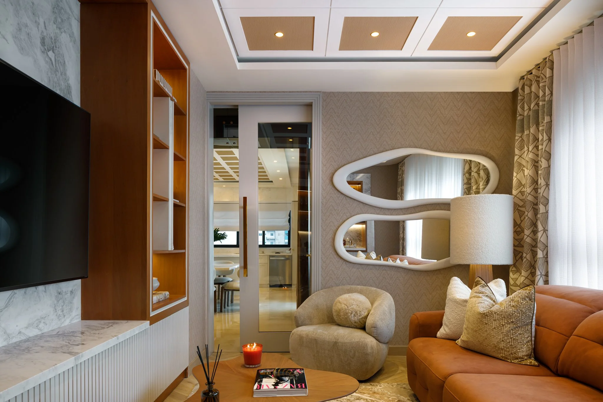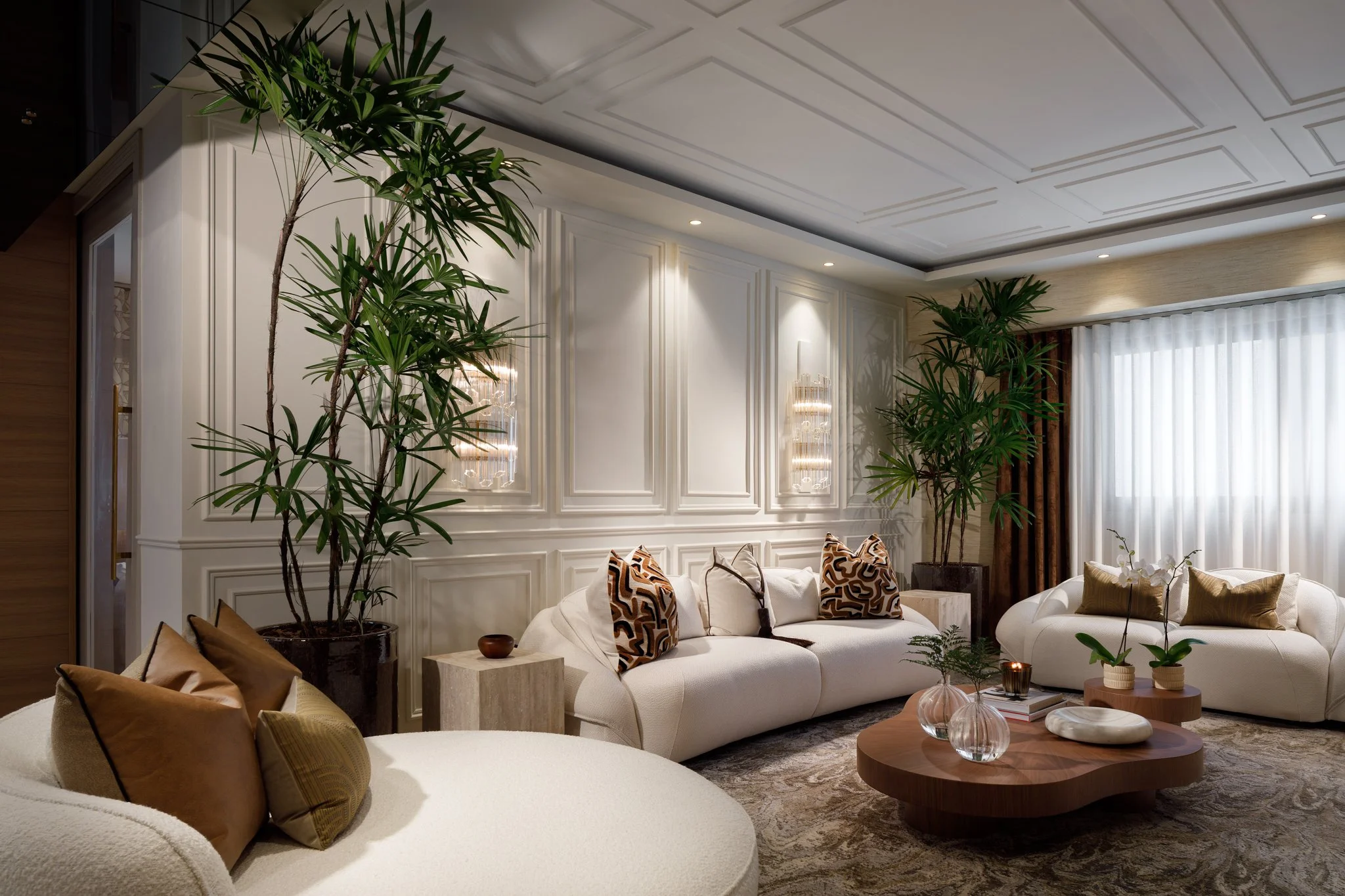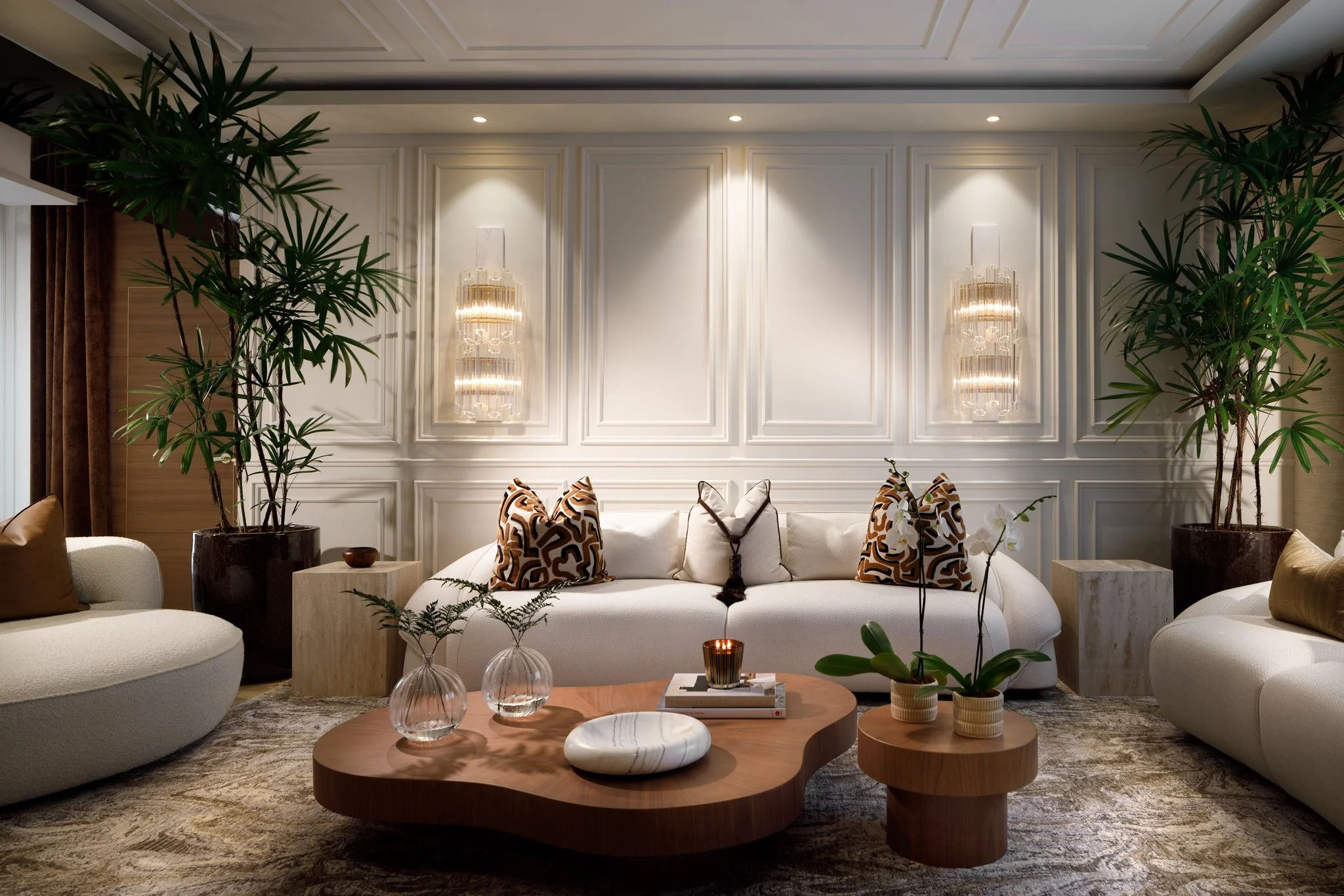 Cada ambiente fue concebido para transmitir elegancia y calidez, combinando mobiliario de líneas orgánicas, texturas naturales y acentos contemporáneos. La luz, tanto ambiental como decorativa, resalta las piezas clave y aporta una atmósfera envolvente que realza la armonía entre confort y estilo.